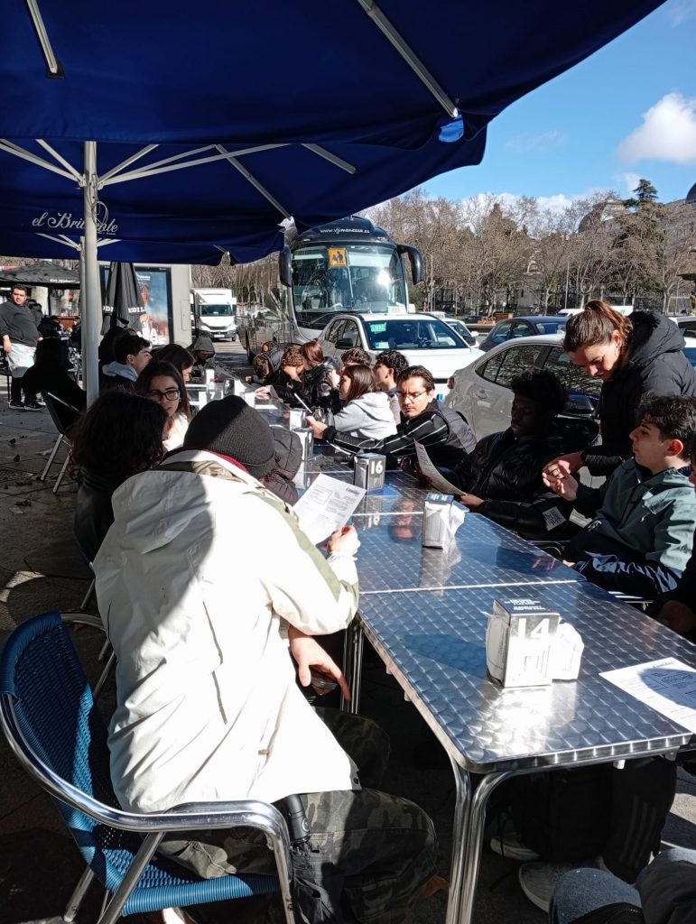 Luego vino lo mejor: una gymkana por el Barrio de las Letras. En grupos mixtos, buscamos monumentos relacionados con figuras literarias importantes, tales como Cervantes, Lorca, Quevedo y Lope de Vega. Entre mapa, bromas y frases mal pronunciadas, los lazos se estrecharon de verdad. Aunque la mayoría de la comunicación giró en torno a la comida, al final, terminamos haciendo buenas “migas”.